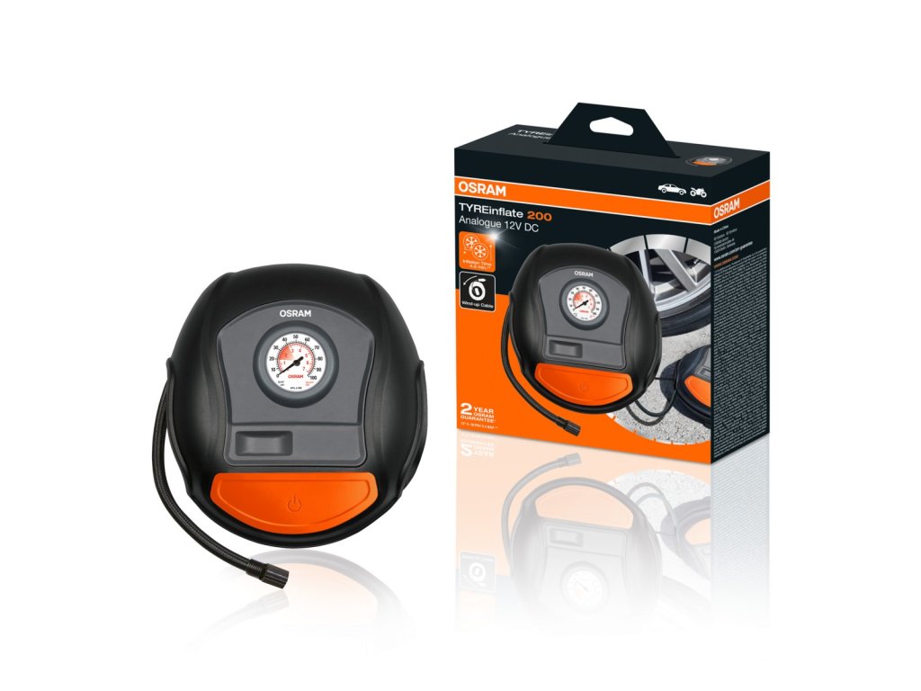 Analogový kompresor OSRAM TyreInflate 200 nafoukne 13" pneumatiku za 4,5 minuty. Má velké tlačítko zapnutí / vypnutí pro snadné použití. Jeho stabilní konstrukce udržuje kompresor stále v provozu.